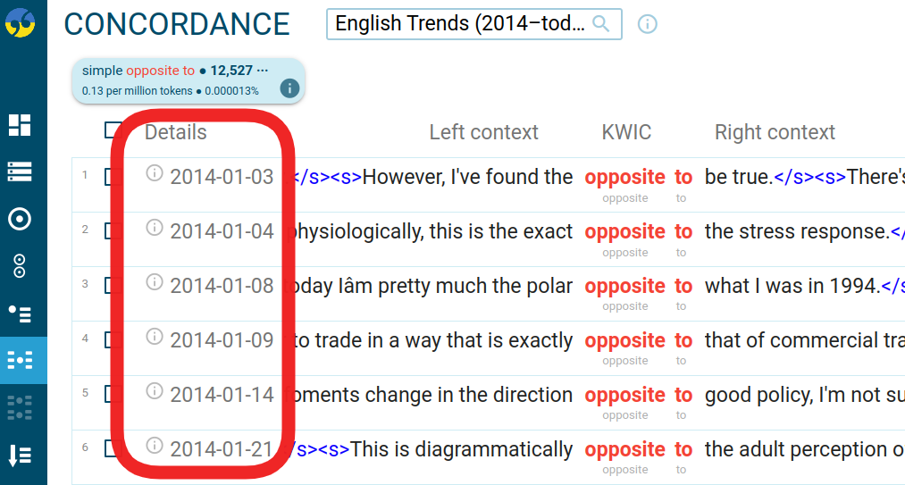 The above configuration will display document year and document website for each concordance line by default.