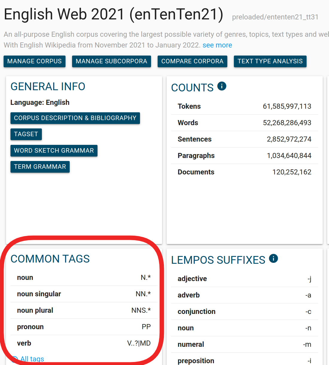 Common tags table on the corpus info page