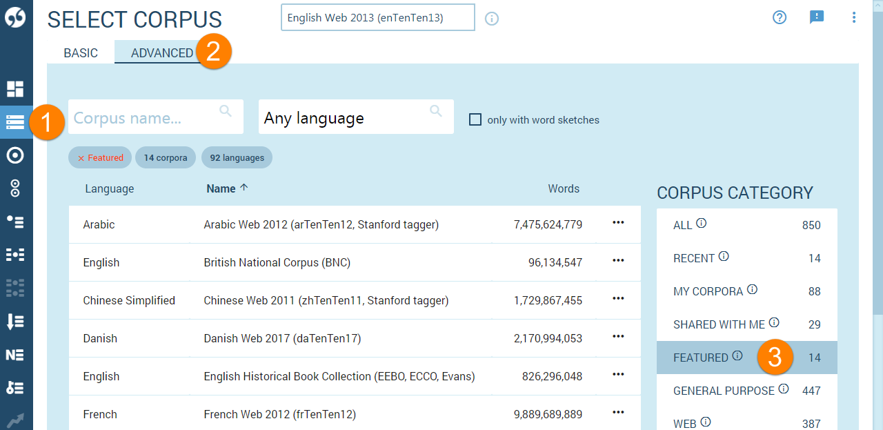 Les corpus mis en avant permettent de s’initier aux corpus monolingues. Ils se distinguent des autres corpus par leur taille, leur qualité et par le fait qu’ils donnent accès à un maximum de fonctionnalités.
