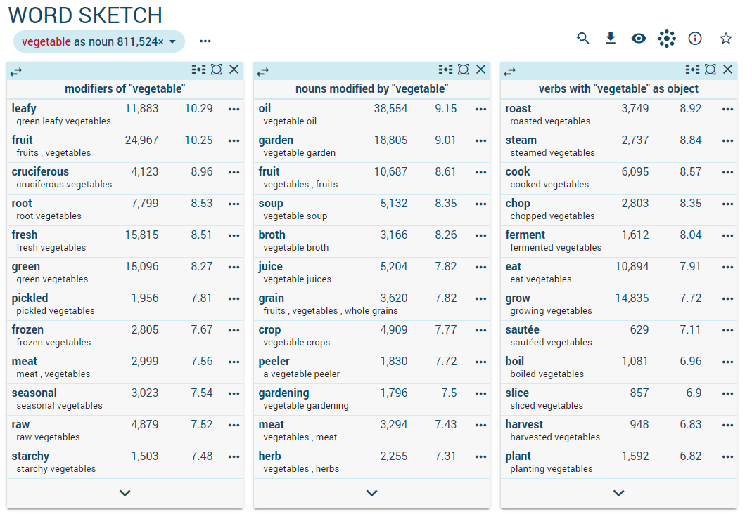 All results in SKELL are a product of ingenious algorithms analysing fully automatically large multi-billion word samples of text, called text corpora. There is no manual work involved when generating the collocations, examples or thesaurus results. See more about the English corpus behind the English SKELL.
