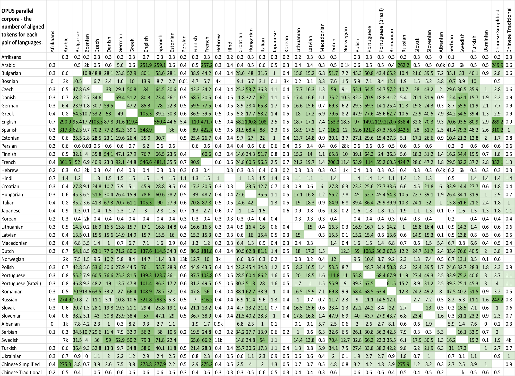 The table shows the number of aligned tokens (in millions) for each pair of languages. Click to enlarge.