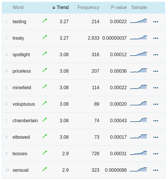 A dedicated service for publishers, lexicographers and content developers to deliver information about new and trending words in English discovered in the latest time-annotated linguistic corpora.