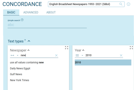The text type selector can be found either in the BASIC tab (concordance), or the ADVANCED tab (wordlist, thesaurus, word sketches, …).