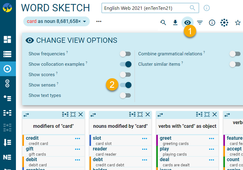 Look at the screenshot showing the collocations and the senses of the lemma card. Sketch Engine identified a total of 4 senses. Clicking on the senses hides or shows the related collocations. Collocations used with several senses and collocations which did not provide sufficient data for the sense to be reliably identified are marked “No sense”.