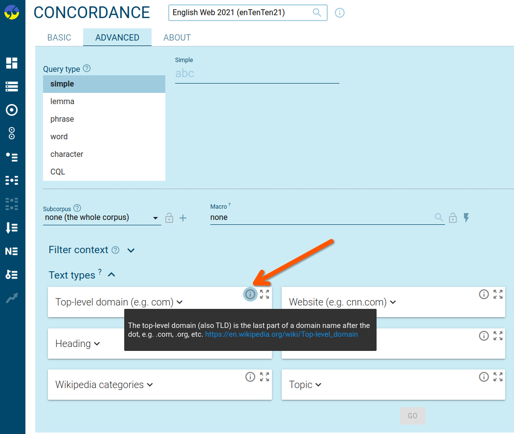 Initially, Text type selectors show the automatically generated names (structure attributes) which may look a bit too technical and not always self-explanatory, e.g. tld. You can rename them by including a nicer label (Top level domain) with each attribute, like this: