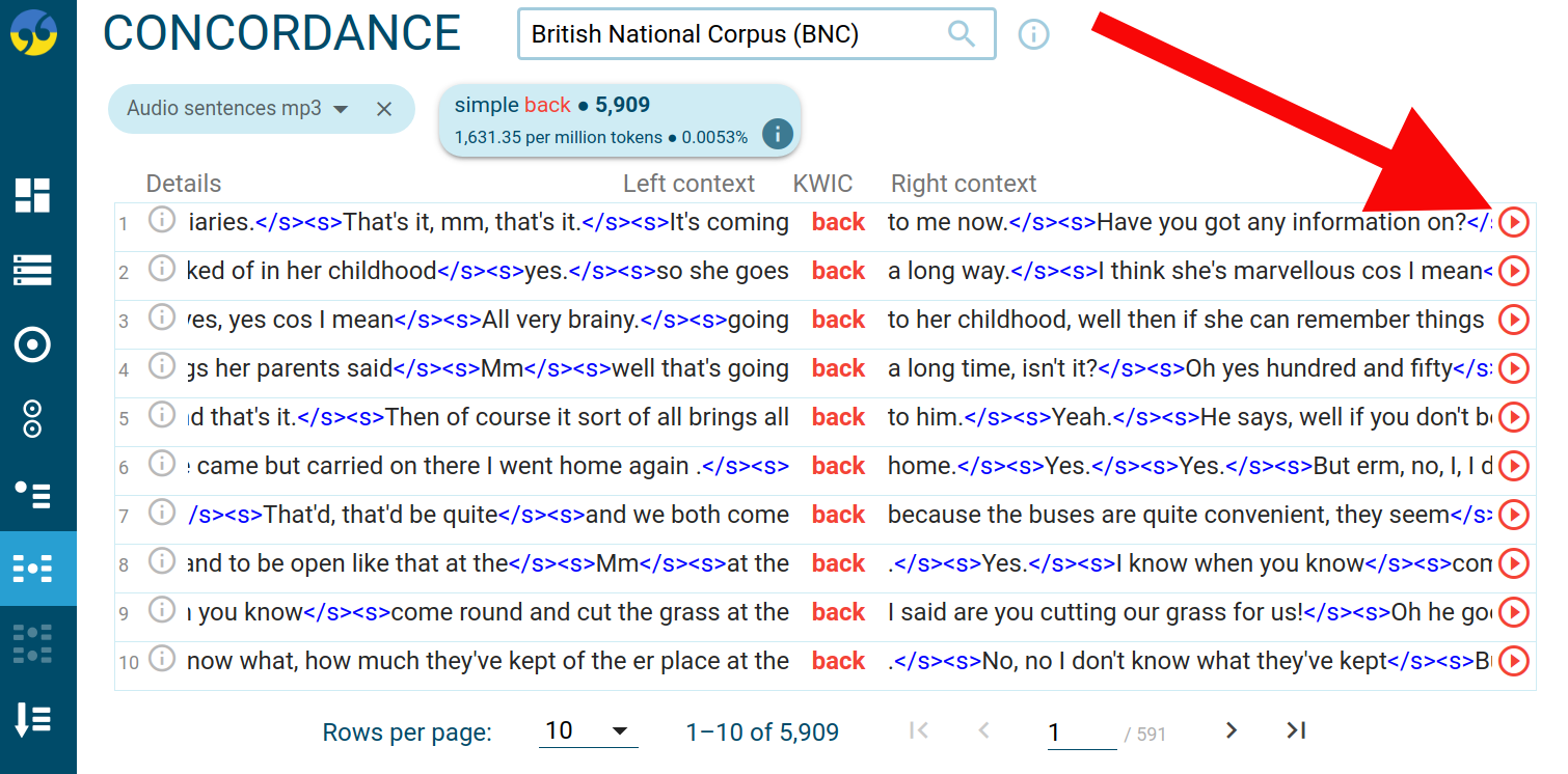 Sketch Engine has support for multimedia corpora, i.e. text corpora with accompanying images, audio recordings, video or other types of multimedia content. Any word, sentence, paragraph, etc. can have a reference to a multimedia file. A multimedia player icon will then appear on the concordance result screen.