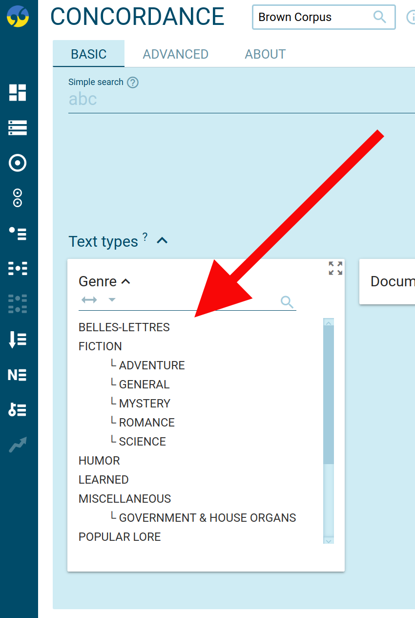 By default, the Text type selector displays all structure attributes in your corpus. This is not always desirable. Some automatically generated text types may not be useful and can be hidden. They can also be reordered to display the related text types close to each other. This makes it easier to use the selector, especially if your corpus contains many text types.