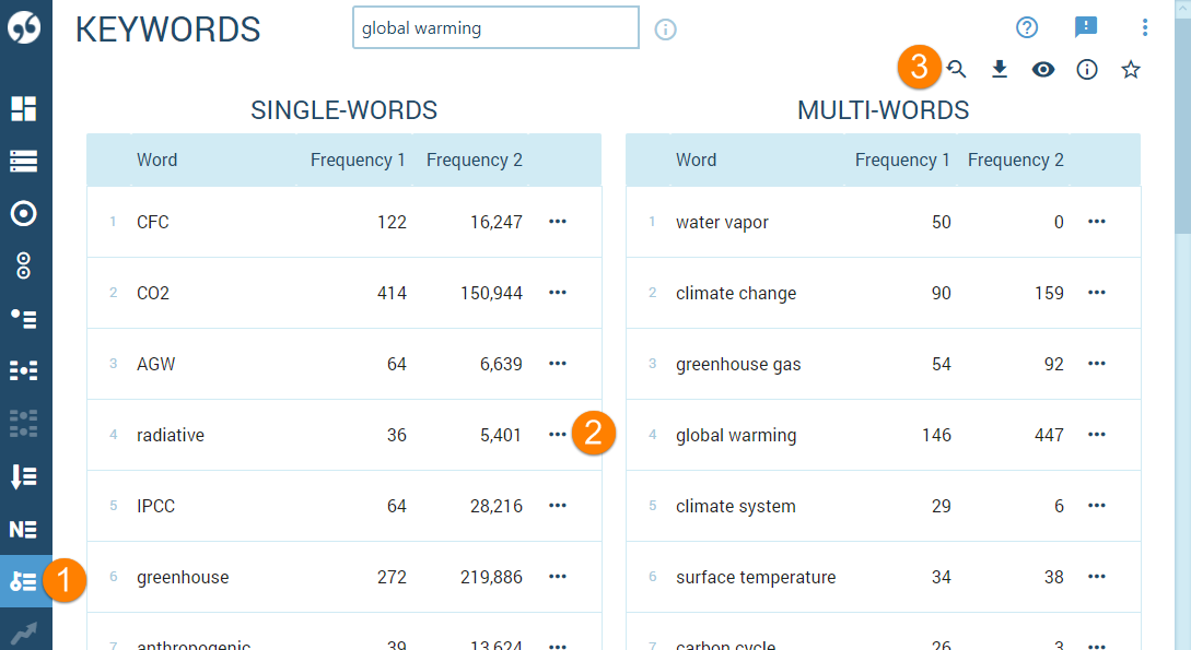 Identifiez-vous et choisissez un corpus. À partir du tableau de bord, cliquez sur MOTS-CLÉS & EXPRESSIONS ou utilisez le bouton équivalent dans le menu principal (1).