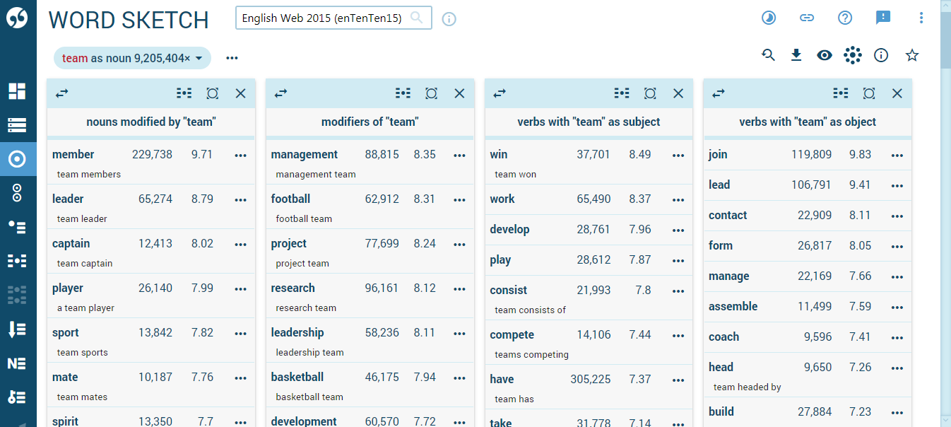 Large modern corpora can contain billions of words with thousands of instances of each word. This makes it unrealistic to look at each concordance line. The word sketch solves this problem. Words surrounding the search word are processed by the word sketch and displayed in a compact, easy to understand format and organized from the most typical to the least typical collocations. The following word sketch was generated from over 9 million instances of the word team. It shows the search word, its frequency, its collocates sorted into grammatical relations, the frequency of each collocate, typicality score, the most frequent representation of each collocation and a local menu with links to other tools.