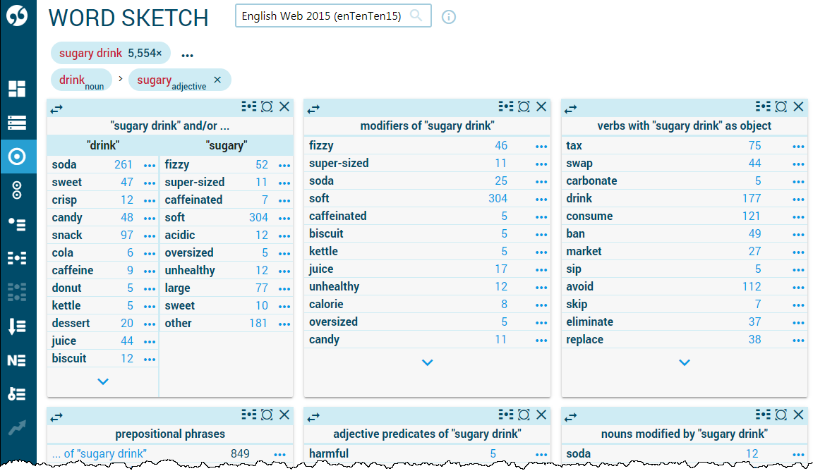 The Word Sketch as a List tab combines all collocations and all grammatical relations into one list. to allow searching, comparing and analyzing all of them together. It is typically used to:
