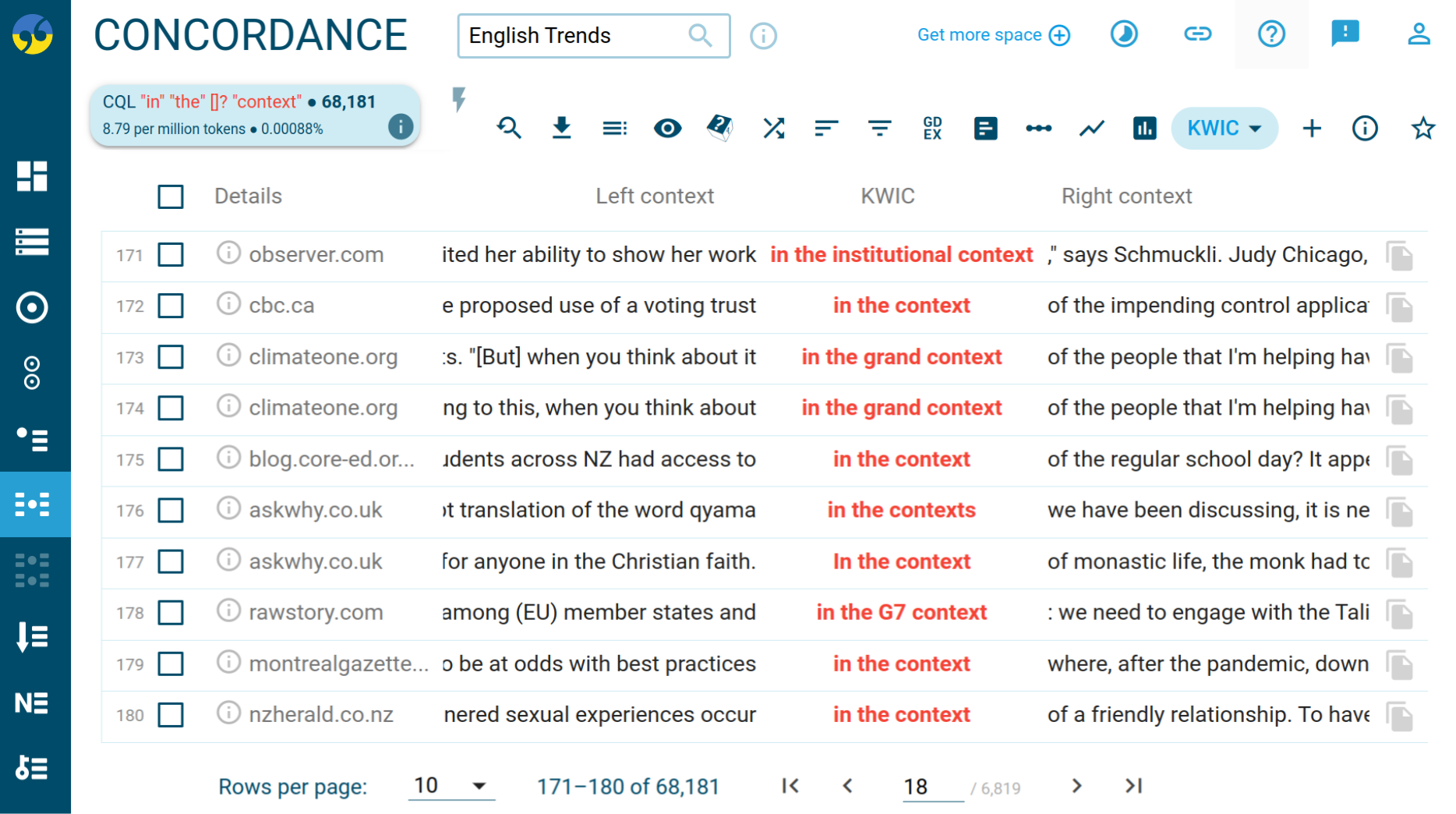 To learn to filter, sort, count, reorganize or process the results, hover the mouse over an icon or the question mark symbol (?) to display a tooltip which explains its function or watch the concordance videos on our channel.