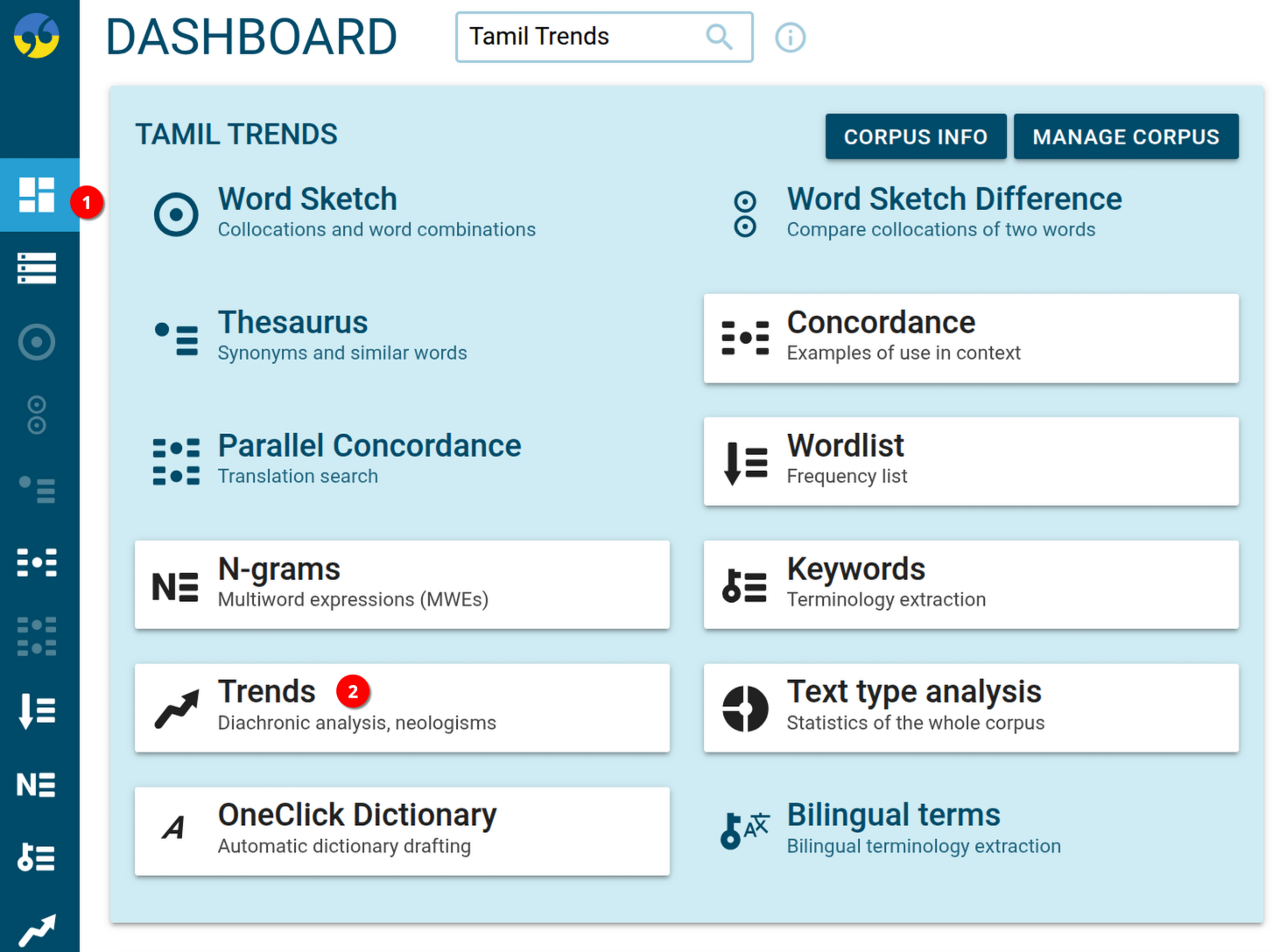 Sketch Engine offers a range of tools to work with this Tamil Trends corpus from news articles.