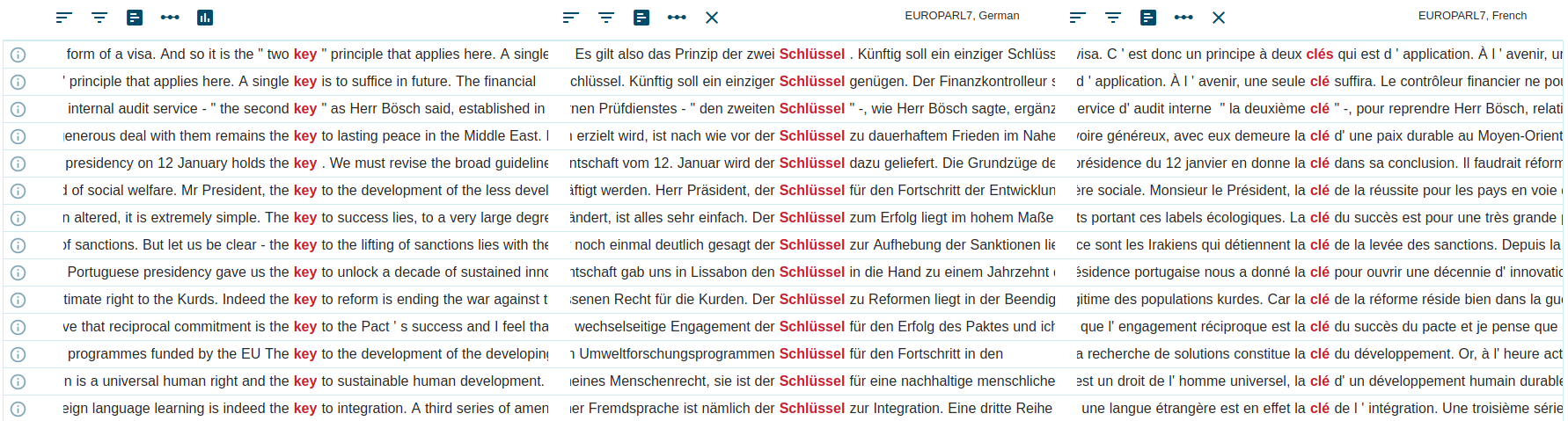 A parallel corpus consists of the same text translated into one or more languages. The texts are aligned (matching segments, usual sentences, are linked). The corpus allows searches in one or both languages to look up or compare translations.