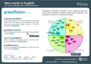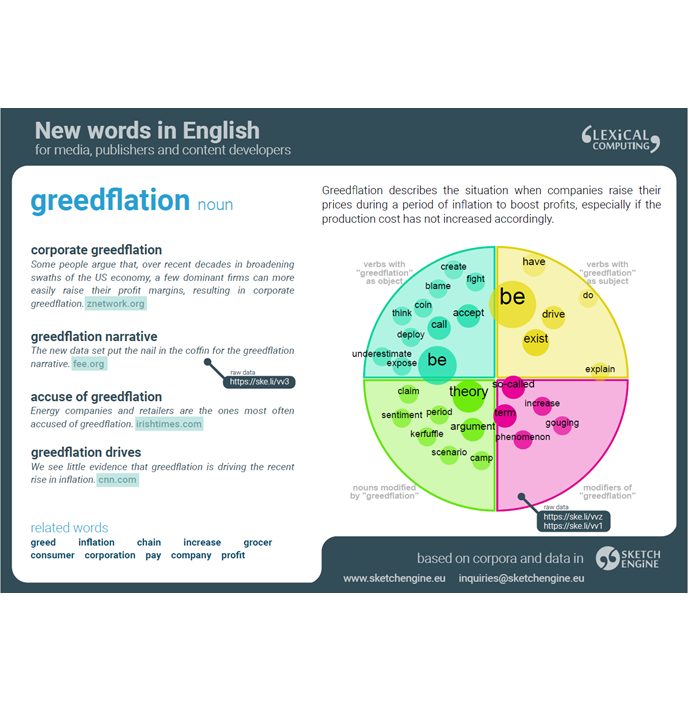 New words in English is a service for publishers, lexicographers and content developers to help them develop interesting and engaging content for their readers or users. The service delivers information about new and trending words in English discovered in the latest time-annotated linguistic corpora.
