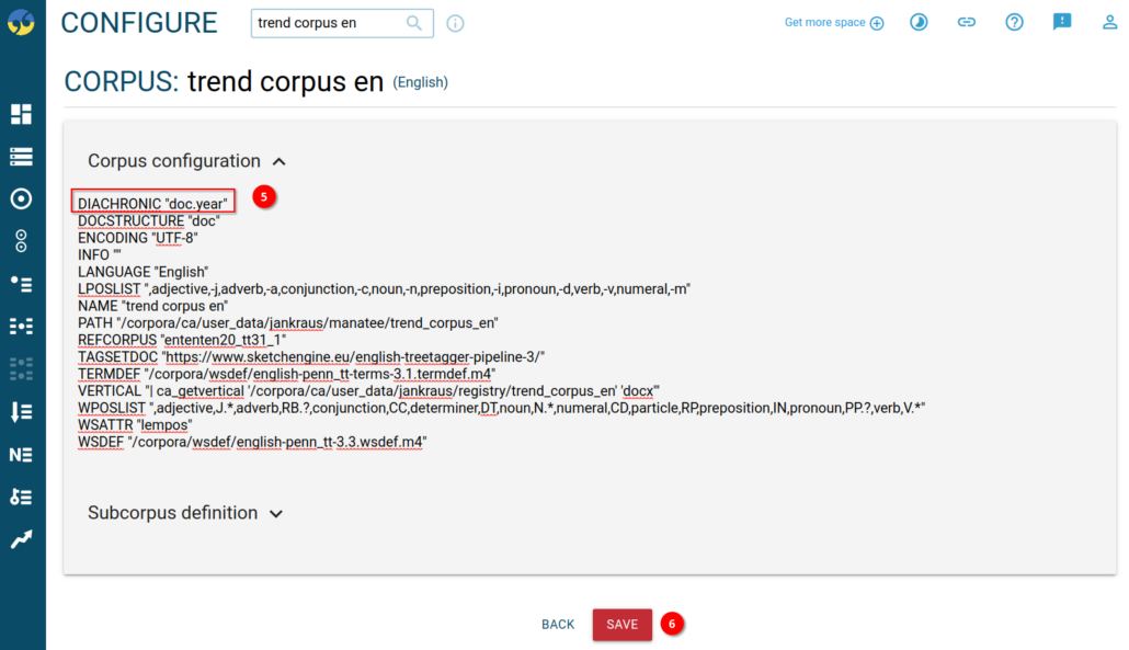 Step 5: As mentioned above, add the DIACHRONIC attribute into the Corpus configuration on a separate line, e.g. at the beginning of the configuration.