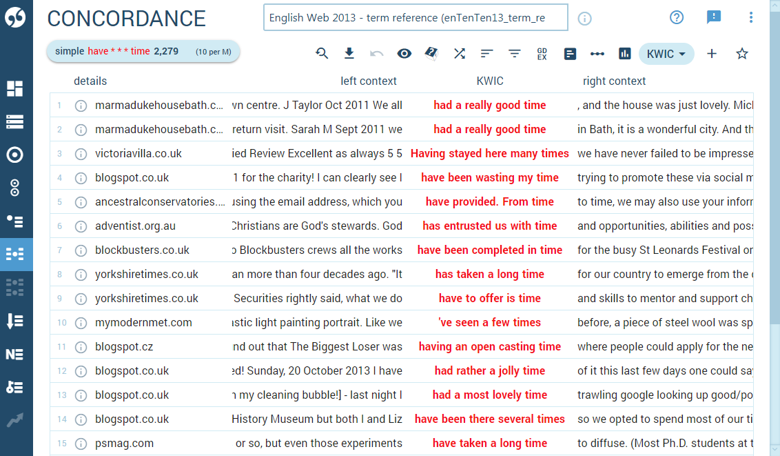 Sketch Engine allows to change the KWIC view to sentence view which displays the complete sentence. The sentence view is only useful in specific cases such as when working with GDEX.