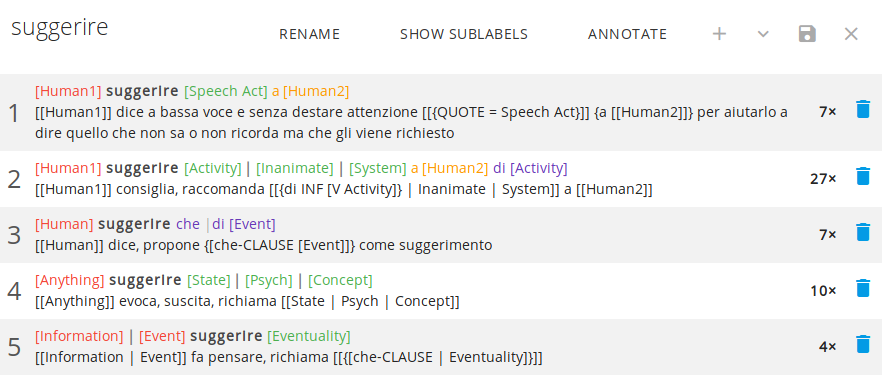 The JSON data can be rendered and shown in the list of labels, next to the label strings. Below is an example of label strings rendered for an Italian annotation project.