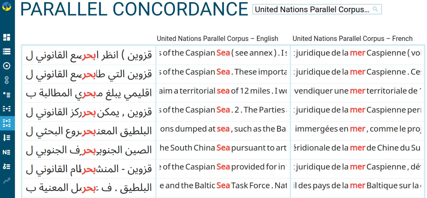 Sketch Engine offers access to hundreds of parallel corpora, including a selection of Arabic texts. Explore United Nations documents, OpenSubtitles texts, the OPUS collection of multilingual data, and more.
