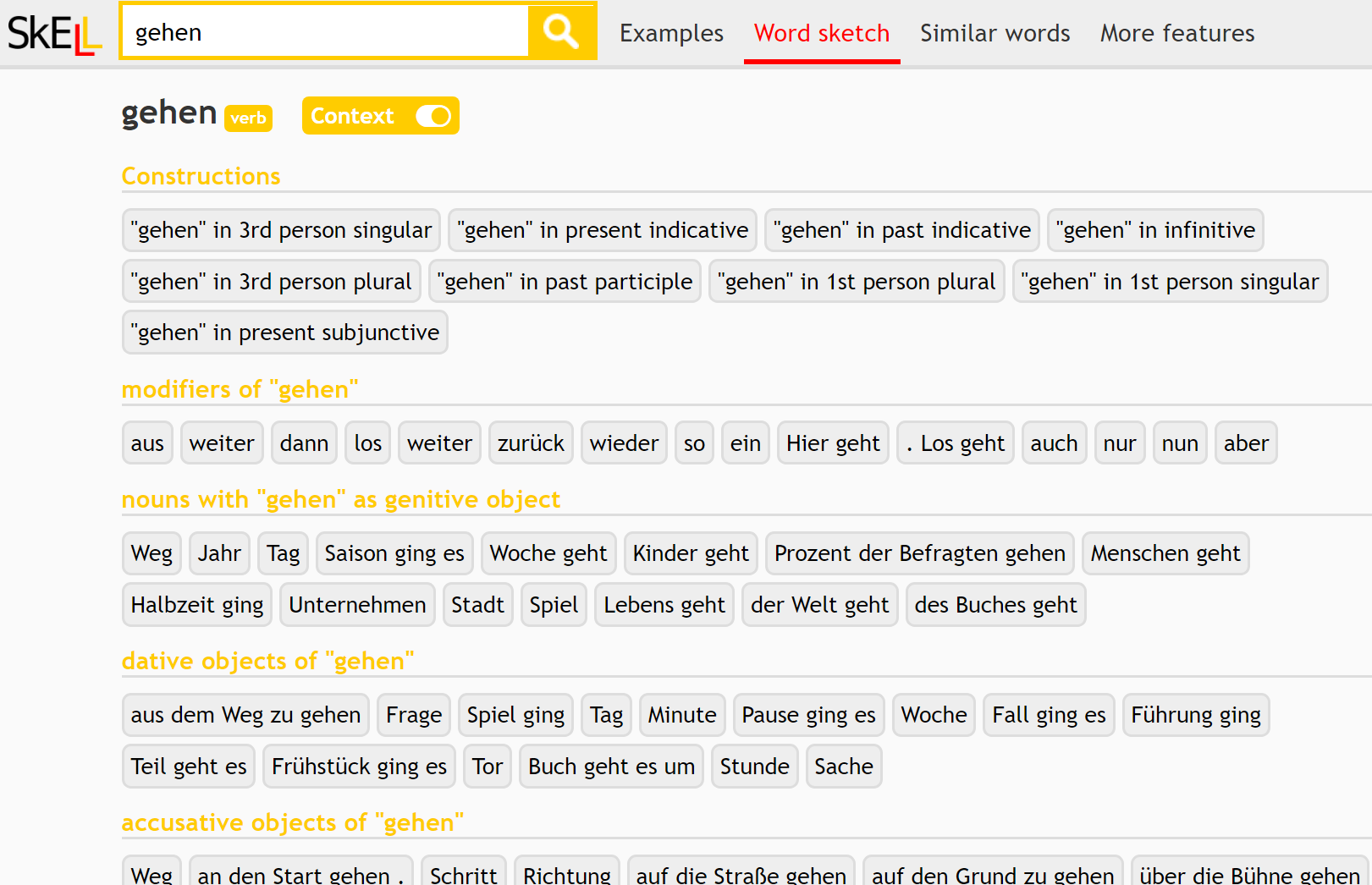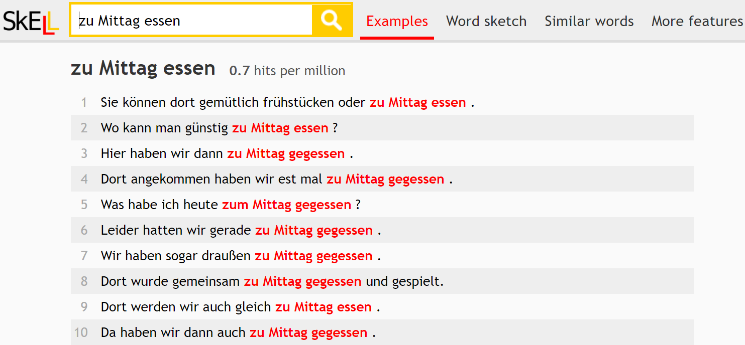 - Examples – display words or phrases in their contexts, it finds up to 40 example sentences containing the word/phrase you searched (view in deSkELL)
