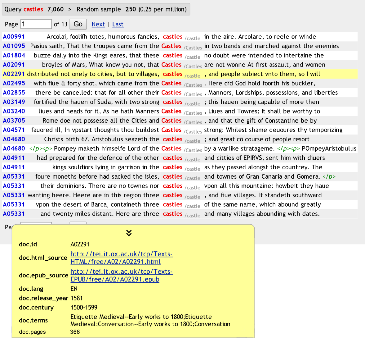 In the corpus, there are metadata allowing you to specify your queries according to release year, century, terms, etc.